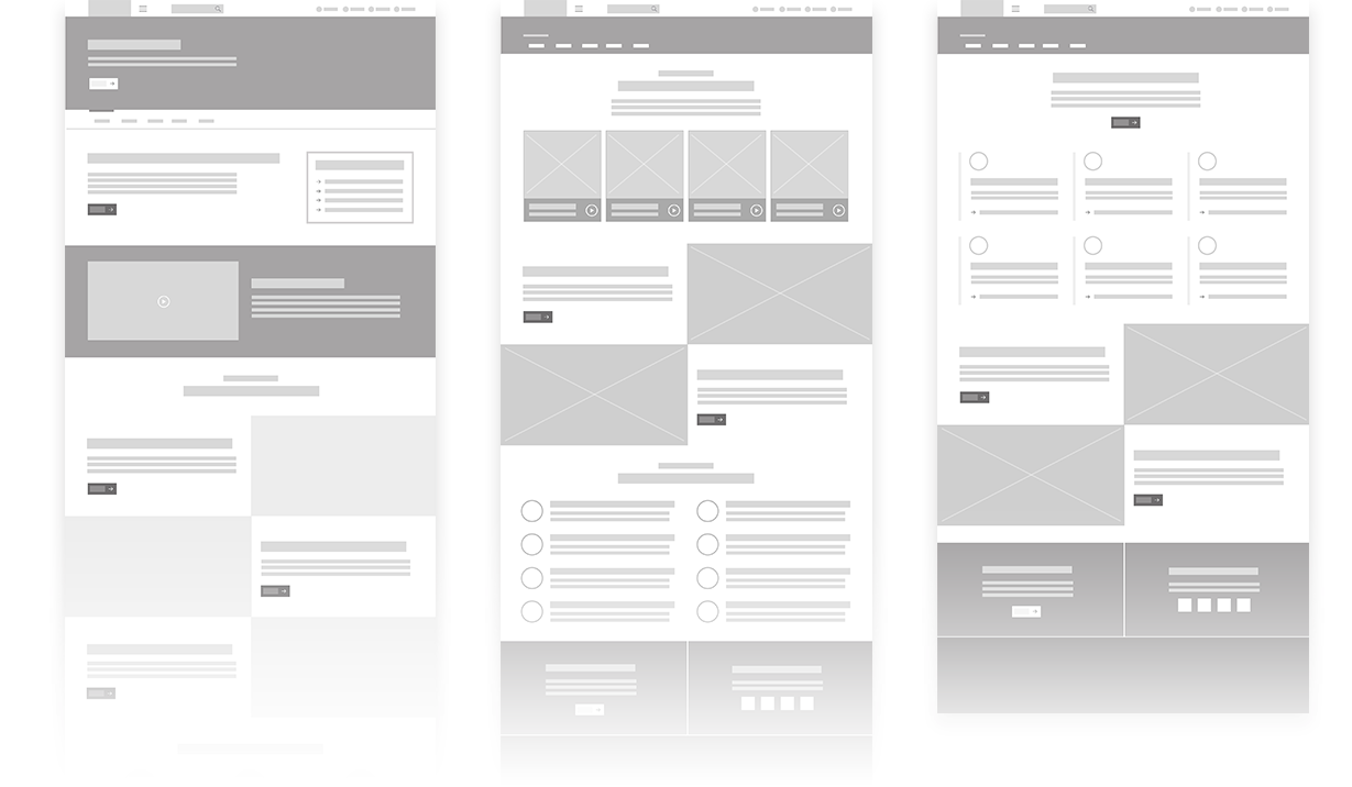After obtaining approval for the site map and user flows, it was time to start assembling lo-fi wireframes. The purpose of not jumping right into high-fidelity is to ensure we are focussing on the structural integrity and not getting too caught up in aesthetics yet. This poses significantly less risk as far as cost and waste. By working with more crude shapes to represent content, we were able to better define the types of patterns that were required to meet the the needs of stakeholders.